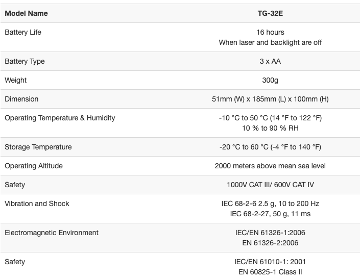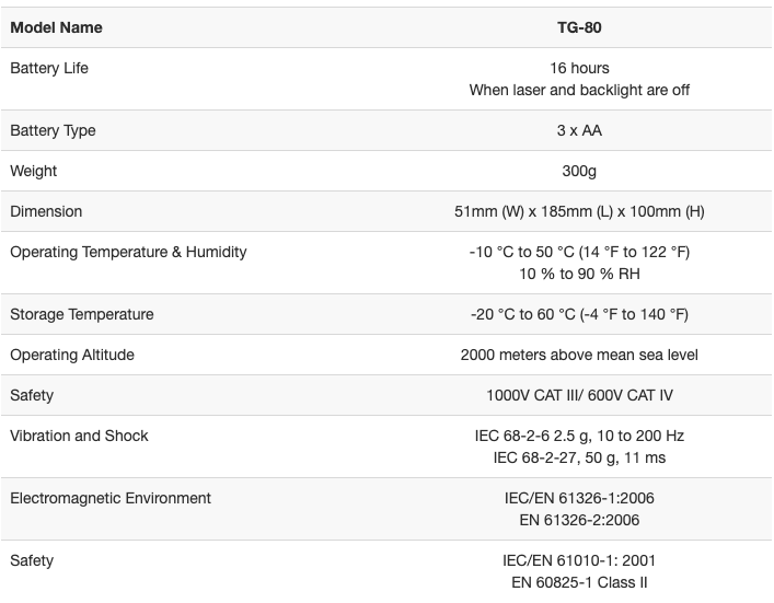 | Safety | 1000V CAT III/ 600V CAT IV | |