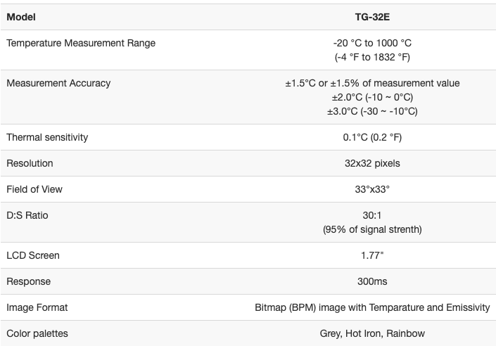 | Temperature Measurement Range | -20 °C to 1000 °C (-4 °F to 1832 °F) |